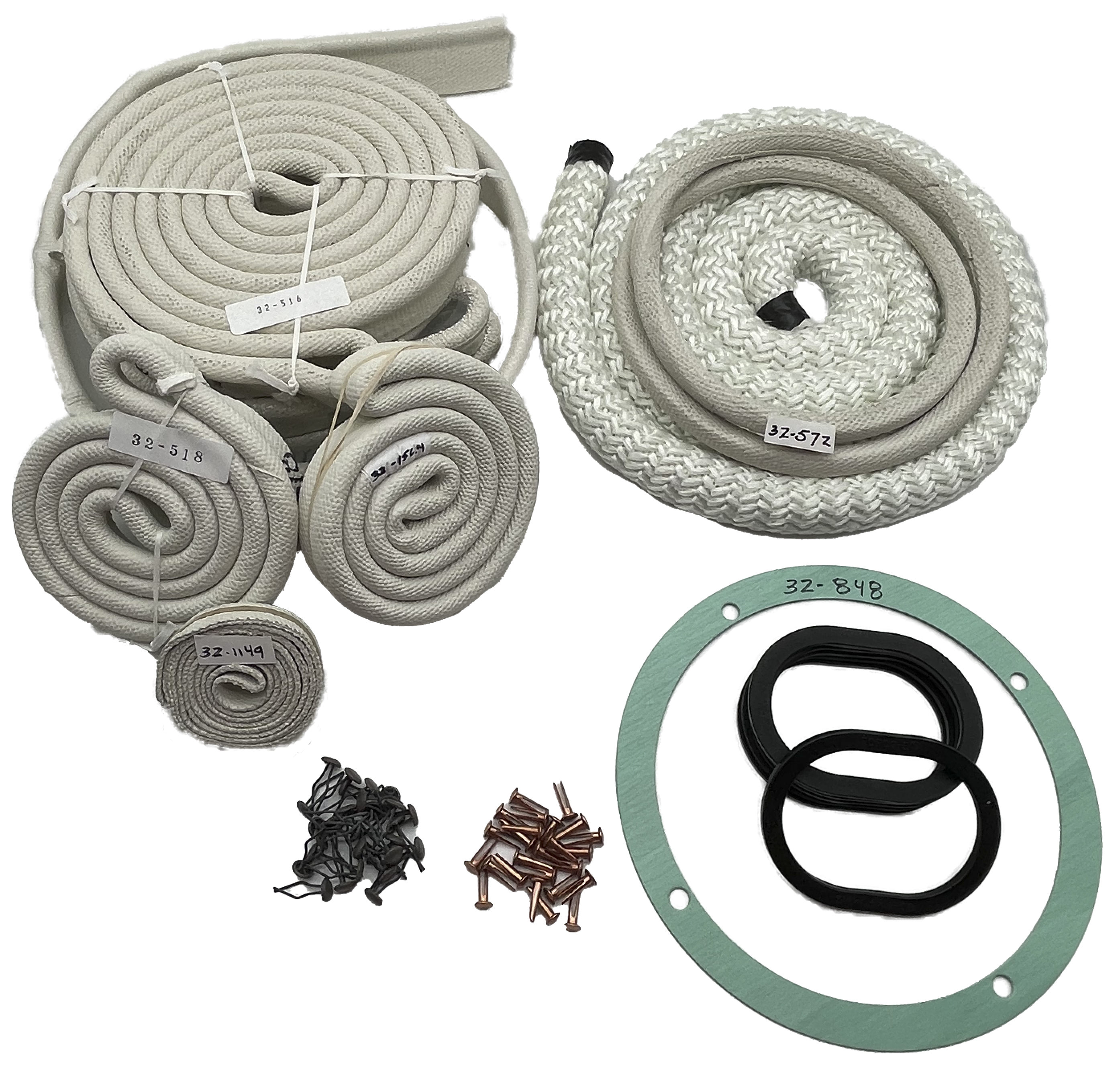 CB Fireside kits include a head gasket, dry oven to door gasket, dry oven to tube sheet, burner drawer gasket, burner housing to head, damper housing gasket, fasteners, rivets, Topog-E gaskets, front baffle tadpole, and rear baffle. These kits are truly all-in-one replacements! Some kits may vary depending on size or boiler horsepower, but see the descriptions below to see what is included in the fireside kit for your boiler.