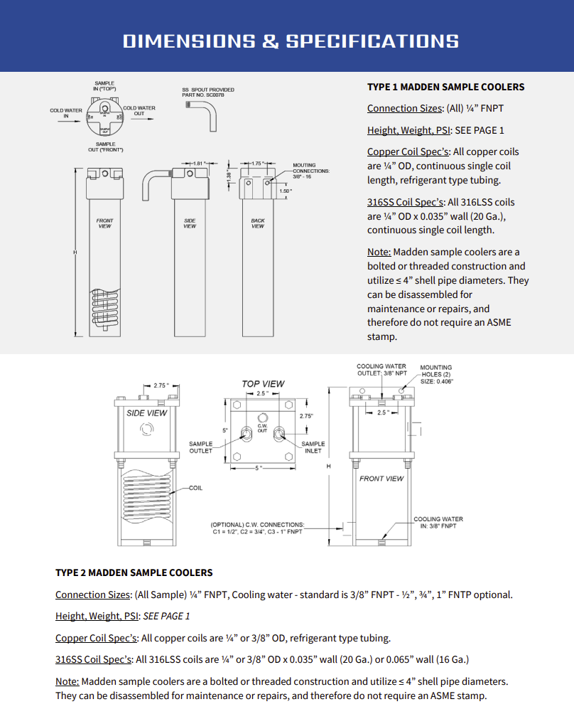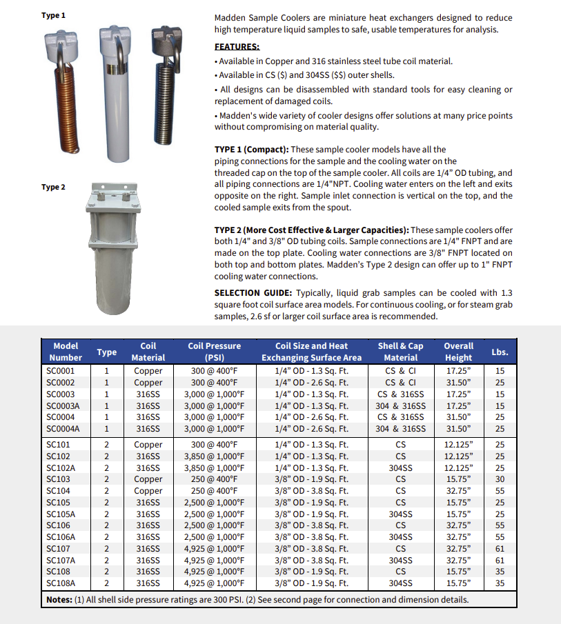 Madden Liquid Sample Coolers are compact heat exchangers designed to lower high-temperature liquid samples to safe testing temperatures and cool pump seal flush liquids. The counterflow design efficiently cools tube-side liquid.
