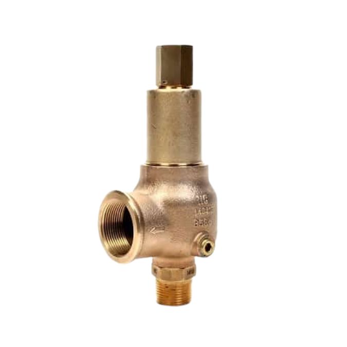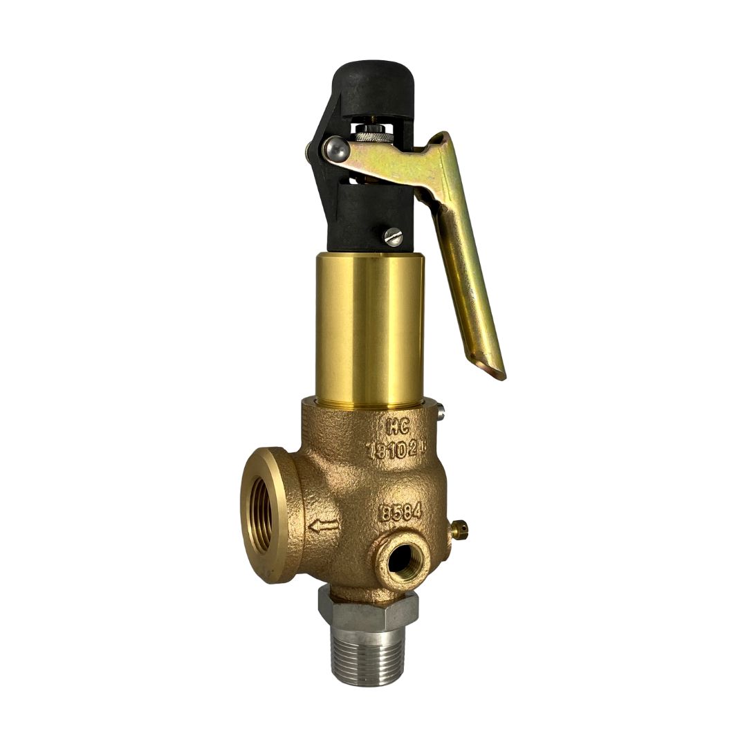 Bronze safety valves that meet ASME section VIII (UV) for air, gas, steam, and liquid, and are National Board certified. Brass/bronze base, body, and bonnet, stainless steel trim. MNPT x FNPT connections.
